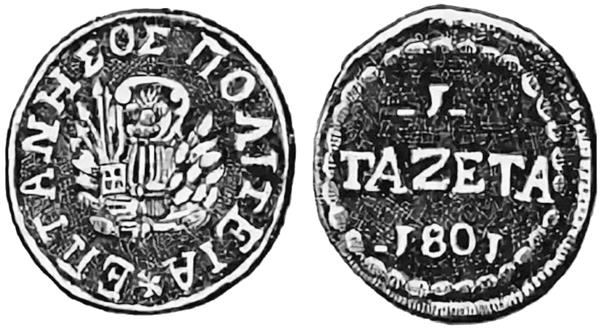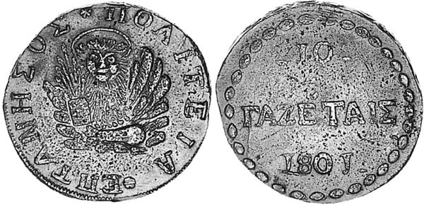 Такие монеты действительно были. Их отчеканили в 1801 году в Республике Семи Островов, которая существовала с 1800 по 1807 год под номинальным русским и османским суверенитетом на Ионических островах. Выпустили бронзовые монеты номиналам в 1 ионийскую газету, в 5 и 10 ионийских газет с изображённым на них крылатым Львом святого Марка (в традициях Венеции, лишь совсем недавно, до 1797 года, владевшей островами). Тиражи были относительно небольшими. Так, по данным каталога А. Карамитсоса (A. Karamitsos «Hellas coins», Thessaloniki, 2008) монет с номиналом 1 газета было отчеканено всего 14 713 штук с трёх штемпелей, отличающихся обрамлением цифры «1» и числа «1801» (в звёздочках или в чёрточках). Монет стоимостью 5 газет изготовили всего не менее 46 158 штук (три разновидности по обрамлению номинала и даты, а также по написанию «GEZZETAI» или «ГАZЕТАIΣ»). Номинала 10 газет было отчеканено 53 250 штук (две разновидности по написанию тех же слов).