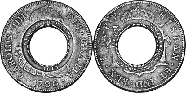 5 шиллингов. «Дырявый доллар» (внешнее кольцо). Изготовлен из испанского доллара 1796 г. Новый Южный Уэльс, 1813 г. Серебро