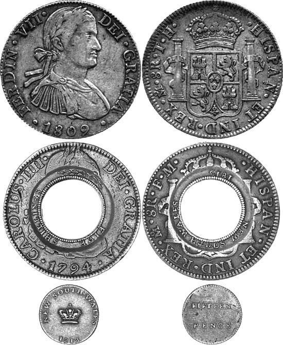 Одной из главных проблем колонии была нехватка денег. Новый Южный Уэльс практически ничего не производил, а лишь закупал товары для своих нужд с огромной отрицательной разностью между поступлениями средств и расходами. В обращении кроме британских находились все монеты, которым можно было более-менее доверять: португальские, нидерландские, индийские. Конечно, особой популярностью пользовался испанский доллар, или пиастр, также известный в англоязычных странах как восьмерик (эта серебряная монета диаметром примерно 38 мм равнялась 8 реалам). Его также называли «пиастр с колоннами», или «столбовой доллар», что происходило от изображённых на реверсе Геркулесовых столпов (как символа края света, куда по силам добраться флоту великой Испании). Поскольку он широко использовался в Европе, Америке и Юго-Восточной Азии, к концу XVIII века испанский доллар стал первой мировой валютой.