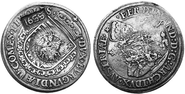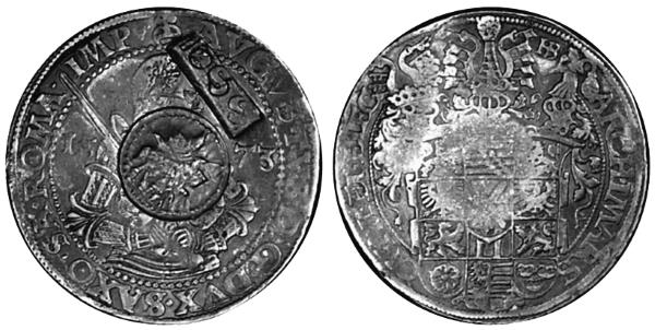 Ефимок с признаком, 1655 г. Надчекан на талере 1573 г. Курфюршества Саксония, Священная Римская империя. Серебро (29,06 г)