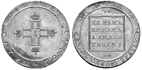 В центре на реверсе изображена двухлинейная рамка с надписью в четыре строки: «НЕ НАМЪ / НЕ НАМЪ / А ИМЯНИ / ТВОЕМУ.». Это девятый стих 113-го псалма Давида, в несколько сокращённом виде («Не нам, Господи, не нам, но имени Твоему даждь славу, о милости Твоей и истине Твоей»). Алексей Шлыков в своё время отмечал, что многие коллекционеры ошибочно полагают, будто эта фраза на монете – девиз Мальтийского рыцарского ордена, гроссмейстером которого был император Павел I. Но это заблуждение.