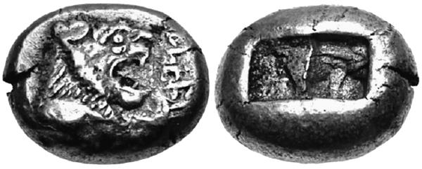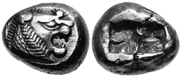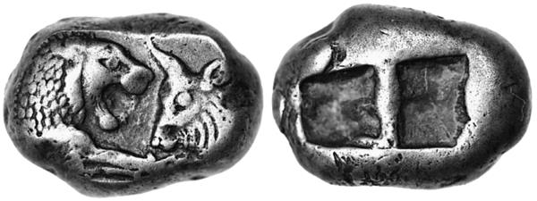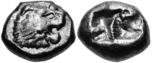 Внешне они выглядели просто. На аверсе чеканилась голова льва (по одной из версий – льва и быка, но данные аукционов относят этот сюжет к более поздним – около 550-х годов до н. э.). А на оборотной стороне всех лидийских монет была глубокая вмятина прямоугольной или сложной конфигурации, напоминающая клеймо. Иногда – две-три вмятины. Но бесполезно пытаться расшифровать смысл отметин. Скорее всего, это просто следы от удара молотком по довольно мягкой заготовке, благодаря которому на лицевой стороне, обращённой к матрице, и получался отпечаток изображения.