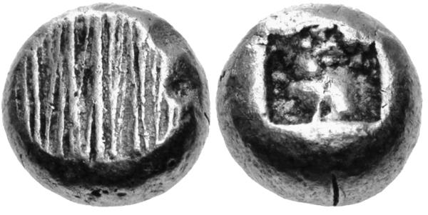 А что же обо всём этом говорят аукционы (вот где ещё один кладезь полезной информации!)? Здесь очень интересно. Такие, например, солидные торги, как лондонские «Classical Numismatic Group», в 2013 году представили целую россыпь древнейших монет. И самыми старыми названы изделия не Лидии, а соседней с ней Ионии. Показаны незамысловатые ионические монеты из электрума с геометрическим рисунком или просто с некими округлыми выпуклостями, сообщаются «крутые» даты чеканки 650–600 года до н э. И можно было бы с радостью принять их за самые древние монетовидные изделия. Но сбивает с оптимистического настроя короткий комментарий самого аукциона: «Неуверенно». То есть и в дате «650» нет уверенности, да и в том, что такие монеты чеканились именно в Ионии – тоже.