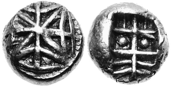 А между тем к 600 году до н. э. свои монеты из электрума, позаимствовав идею у Лидии, уже выпускали и в греческих полисах. Независимо от этого около 600 года до н. э. монеты (как считается) повторно и самостоятельно изобрели в Китае – первые китайские деньги чеканились из бронзы в виде… миниатюрных ножей и лопат. В Индии тоже около 600 года до н. э. начали делать близкие к прямоугольной форме каршапаны. Примерно в это же время в Ионии появились первые серебряные монеты гемиоболы (а вот по серебряной чеканке первенство, судя по этому, остаётся за Ионией, которая в деле изобретения монет как таковых отстала от Лидии на считаные годы).