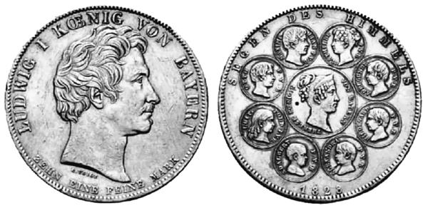 Талер с изображением короля Людвига I и его семьи. Бавария, 1828 г. Серебро
