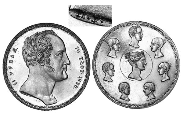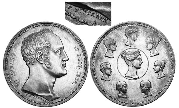 Третий штемпель 1836 года: под профилем императора на срезе надпись «П.У.», на реверсе портреты детей на гладком фоне, кант монеты в полной сохранности.