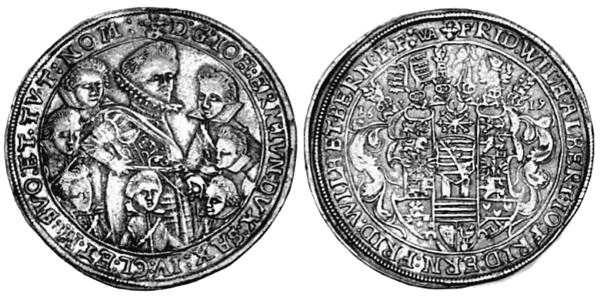 Один из первых «семейных» талеров. Иоганн-Эрнст Саксен-Веймарский (1594–1626, герцог в 1605–1620 гг.) с семью братьями. Саксен-Веймар, 1619 [?] г. Серебро (29,14 г, 41 мм). Аукцион «Classical Numismatic Group», 2013 г.