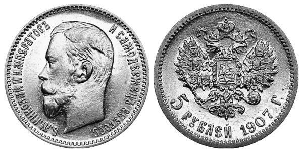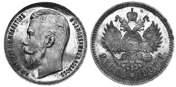 Кроме сильно ограниченного тиража золотых пятирублёвиков, в 1907 году выпустили очередную партию серебряных рублей регулярного чекана. Тираж был достаточно большой, сложностей с монетой нет. Её средняя цена от 2160 рублей в сохранности «VG» («удовлетворителная») до 185 800 качества «proof» («полированная»). Но и тут есть свои нюансы.