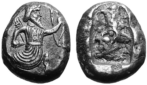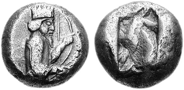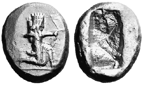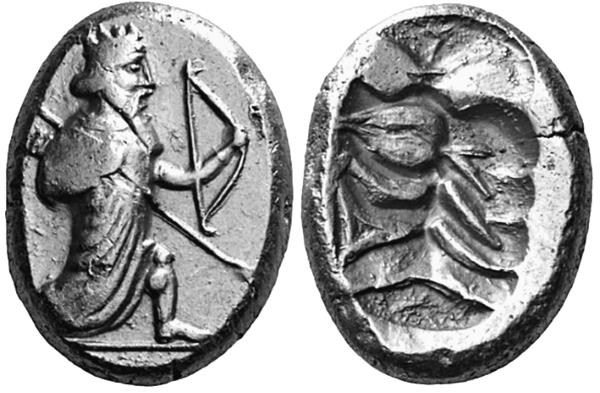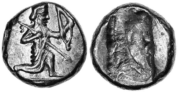Тип II, 505–480 годы до н. э. Царь в коленопреклонённой позе стреляет из лука вправо, копья нет. С таким изображением известны дарики, сикли и серебро дробных номиналов.