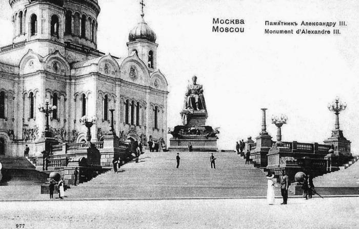 Сооружение памятника возле храма Христа Спасителя задумали после кончины императора в 1894 году, но постройка началась только в 1900 году и затянулась надолго. Главным скульптором был А.М. Опекушин – автор знаменитого московского памятника Пушкину, архитектором – А.Н. Померанцев (1849–1918). Торжественное открытие организовали 30 мая 1912 года (по старому стилю) с участием императорской семьи. Но трон под бронзовым Александром III зашатался очень скоро, уже в 1918 году тот был свергнут с пьедестала. А в 1931 году вместе с собором взорвали оставшийся постамент.