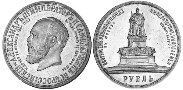 Реверс представляет сам монумент и номинал: «РУБЛЬ». Надпись слева от изображения сообщает: «СООРУЖЕНЪ ЛЮБОВЬЮ НАРОДА», и меньшим шрифтом: «ВЪ МОСКВЪ», справа: «ИМПЕРАТОРОМЪ НИКОЛАЕМЪ II», и меньшим шрифтом: «ОТКРЫТЪ ВЪ 1912 Г.».