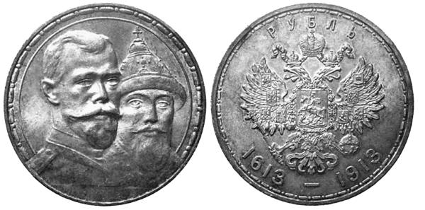 За образец для аверса монеты взяли барельеф ранее изготовленной медали работы Михаила Аркадьевича Керзина (1883–1979), автор монеты – медальер Антон Фёдорович Васютинский (1858–1935). На аверсе рублёвой монеты помещено изображение императора Николая II Александровича (1868–1918) в форме 4-го лейб-гвардии Императорской Фамилии стрелкового полка и Михаила Фёдоровича (1596–1645), первого правителя из династии Романовых, в царском одеянии и шапке Мономаха. На реверсе государственный герб, над ним надпись «РУБЛЬ», а под гербом юбилейная дата «1613–1913». На гурте оттиснута обычная для рублей того периода надпись: «ЧИСТАГО СЕРЕБРА 4 ЗОЛОТНИКА 21 ДОЛЯ (В-С)». Буквы в скобках представляют инициалы последнего (1912–1917 годы) минцмейстера Санкт-Петербургского монетного двора Виктора Петровича Смирнова.