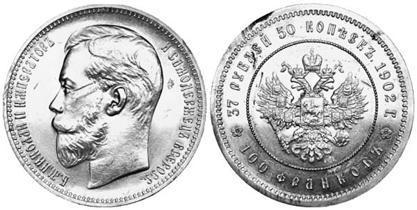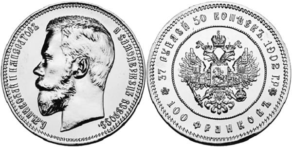 Впрочем, тесные дружественные связи двух стран начали укрепляться ещё в первые годы после восшествия на престол Николая II. В 1896 году состоялась коронация нового императора, а в начале осени он с супругой и дочерью Ольгой отправились в большую поездку по Европе. 5–9 октября венценосная чета была во Франции. Гости сошли с палубы яхты «Полярная звезда» в порту Шербура и на спецпоезде направились в Париж. На вокзале французской столицы «специально по случаю» был поставлен изящный павильон. Это визит вице-президент французской палаты депутатов Раймон Пуанкаре (1860–1934), будущий президент Третьей республики, назвал «медовым месяцем» франко-русских отношений. Тесно сотрудничали и монетные дворы двух государств. Наверное, в этом причина появления «парижской звёздочки» на гурте. Но доля участия Парижа в изготовлении монеты «37 рублей 50 копеек / 100 франков» не установлена.