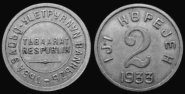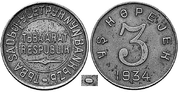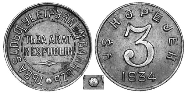 Уже писал, что начало чеканки тувинских монет приходится на 1933 год, но экземпляры с этой датой чрезвычайно редки. К тому же, как утверждают в Интернете, известны не все номиналы – достоверными к настоящему моменту являются только 2 копейки, 3 копейки, 5 копеек и 10 копеек. Некоторые специалисты считают их пробными, другие склоняются к версии, что весь большой тираж 1933 года пропал вместе с самолётом, на котором их везли к месту назначения. Ясности пока нет, нужны находки документов в архивах.