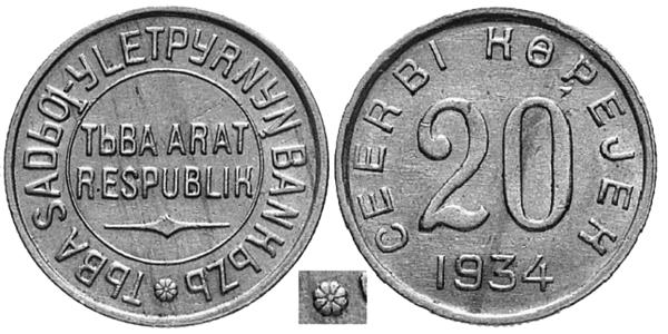 Есть среди тувинских монет интересная и редкая разновидность. На монетном дворе перепутали штемпели, и некоторое количество трёхкопеечных было по ошибке получилось с лицевой стороной 20-копеечного номинала. Благо диаметры монет почти-почти одинаковы, надписи на аверсах идентичны. «Перепутку» отличает наличие внизу на аверсе цветочной розетки вместо «фасолины» – овальной точки – и чуть-чуть более широкий ободок, появившийся из-за разницы в диаметрах штемпелей. В отличие от других тувинских эта монета достаточно дорогая.