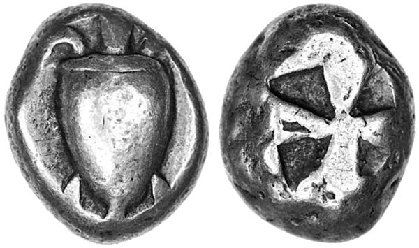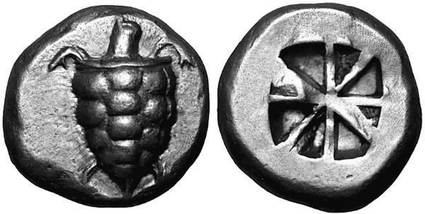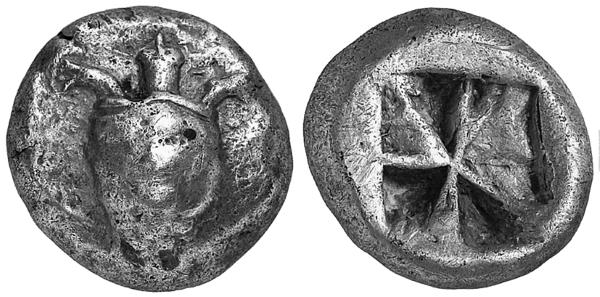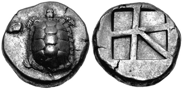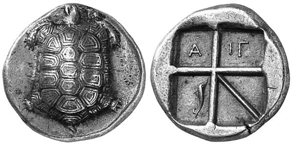 Вся первая эгинская чеканка легко узнаётся по изображению морской черепахи. Некоторые историки считают, что выбор символа был обусловлен развитой морской торговлей, другие связывают изображение этого морского животного с тем, что кусочки серебра имели выпуклую форму и напоминали эгинцам черепах. Серебро на Эгине было собственное благодаря контролю над островом Сифнос, где существовали месторождения. Эгинский статер ходил по всему греческому миру несколько веков.
