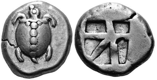 Названный в честь нимфы Эгины остров – второй по величине среди Саронических островов. Расположен он к югу от Афин, всего в 27 километрах. Почвы на Эгине довольно скудные, каменистые, поэтому жителям самим провидением было предначертано заниматься торговлей и быть умелыми мореплавателями. Удачное географическое положение сделало их чуть ли не монополистами в морской торговле и немало обогатило. В своих путешествиях моряки Эгины узнали, что Лидия, а затем и Иония чеканят собственную монету, и поняли, насколько просто хранить накопления в небольших по размерам изделиях из драгоценных металлов и насколько удобно пользоваться ими в других странах во время торговых операций. И довольно скоро, как уже говорилось, первыми из государств Европы переняли опыт. Свою чеканку на острове начали в середине VI века до н. э.