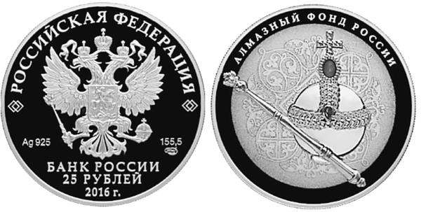 В общем, после длительных мучений решаем так: из десятков и даже из сотен равных назначаем великой монетой 25-рублёвую чеканку из серии 2016 года «Алмазный фонд России» с изображением на реверсе «Короны Российской империи». Вес её в серебре 925-й пробы 168,1 г (нормативная масса химически чистого металла 155,5 г). Диаметр 60 мм, толщина 6,6 мм. Рыночная стоимость металла в начале августа 2021 года 9313 рублей. Тираж 150 штук.