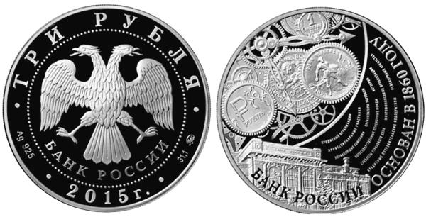 Три рубля «Банк России основан в 1860 году». ММД, 2015 г. Серебро 925-й пробы (33,94 г, чистого металла 31,1 г, 39 мм)