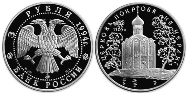 3 рубля «Церковь Покрова на Нерли». ММД, 1994 г. Серебро 900-й пробы (34,88 г, чистого металла 31,1 г, 39 мм)