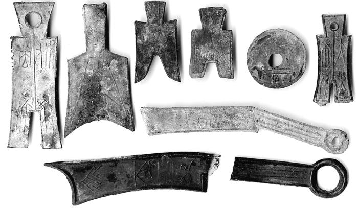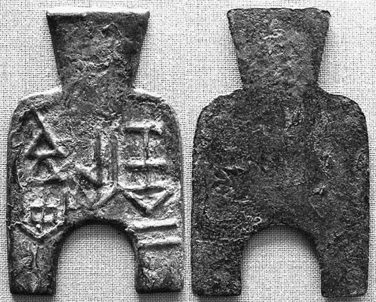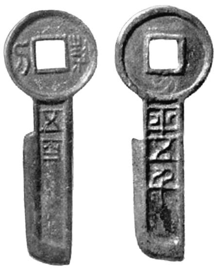 Вот ещё цитата: «Древнейшие китайские монеты в виде музыкальных пластин и колокольчиков, лопат и ключей не имеют никаких надписей. На более поздних монетах, повторяющих форму лопат и мотыг, ножей или колец, которые подражают форме пряслиц, встречаются иногда довольно пространные надписи. Они представляют собой ряд китайских иероглифов, выполненных древними почерками (…), которые сильно отличаются от современных почерков. В надписях большей частью указано место выпуска монеты или вес её (стоимость), а иногда и то и другое».