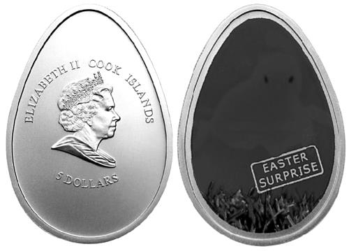 Не без труда удалось выбрать действительно значимую эмиссию, сделанную не только ради забавы. В 2009 году Острова Кука выпустили в обращение две монеты необычной конфигурации, посвященные празднику Пасхи. Первая в форме яйца весьма примечательна. Аверс имеет изображение королевы Елизаветы II, название страны и обозначение номинала в 5 новозеландских долларов. На реверсе яйцо выкрашено однородным красным цветом и как бы лежит на зелёной травке. В легенде реверса лишь одна надпись: «EASTER SURPRISE» («ПАСХАЛЬНЫЙ СЮРПРИЗ»). Но стоит взять монету в руки, и благодаря теплу человеческого тела она действительно преподносит сюрприз: проявляется изображение только что вылупившегося цыплёнка. Обеспечили превращение сотрудники лихтенштейнской фирмы CIT («Coin Invest Trust») и известной немецкого предприятия «B.H. Mayer᾽s…». Сложный процесс печати с использованием термокрасок позволил сделать это «волшебство» возможным. Изображение исчезает, когда поверхность охлаждается.