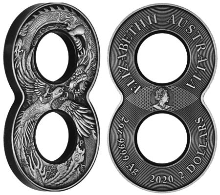 2 австралийских доллара. Дракон и феникс, цифра 8 – символы гармонии и удачи. Австралия, 2020 г. Серебро (62,21 г, 41,7 × 70 мм)