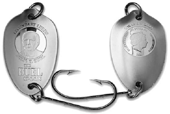 Рыболовная блесна, монета посвящена одному из пионеров рыболовства Хулио Т. Буэлю, изобретателю такого рода снасти (Острова Кука, 2020 год, исполнение в золоте и в серебре);