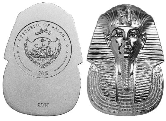 Маска Тутанхамона (Палау, 2018 год, серебро, позолота; Гана, 2020 год, мельхиор, позолота);
