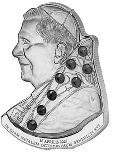 Портрет Бенедикта XVI, к его 80-летию (Острова Кука, 2007 год, серебро, золото, кристаллы Сваровски);