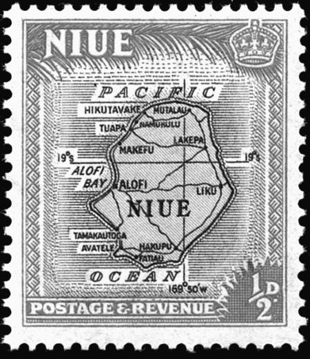 1/2 пенни. Почтовая марка Ниуэ. Карта острова, 1950 г.