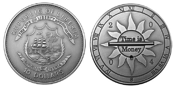 В том году Республика Либерия, стремясь завоевать популярность у коллекционеров, ну и, разумеется, получить выгоду, заказала в Бальцерсе (Лихтенштейн), где работает мощное предприятие по изготовлению монет, необычный знак оплаты с настоящими солнечными часами.