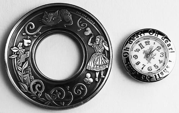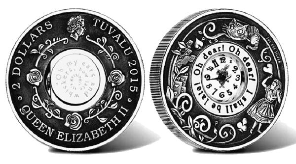 А вот, наверное, самым ленивым, кому совсем уж не охота возиться с солнечными часами, собирая и разбирая их, Пертский монетный двор в 2015 году изготовил от имени Тувалу очень красивую памятную монету к 150-летию написания «Алисы в Стране чудес». Если помните, в сказке фигурируют часы, которые Алиса достаёт из кармана кроличьего жилета. Так вот к юбилею приключений Алисы такие настоящие работающие часы встроили в монету.
