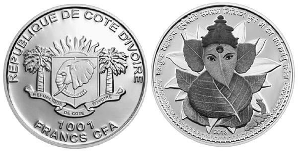 Иные инвестиционные монеты просто очаровывают своей красотой и оригинальностью. Мне, например, очень нравится серебряный шедеврик (999-й пробы), отчеканенный в 2013 году от имени республики Кот-д᾽Ивуар (Берег Слоновой Кости) известной германской фирмой Б.Х. Майерс («B.H. Mayer᾽s Kunstprageanstalt GmbH», Karlsfeld). Монета с гербом африканского государства на аверсе и с довольно загадочным номиналом 1001 западноафриканский франк (CFA), на реверсе представляет одну из самых известных и почитаемых фигур индуистского пантеона – Ганешу, бога мудрости и благополучия с головой слона. Образ божества умело и оригинально составлен из изображений листьев фикуса с вкраплением кристалла Сваровски.