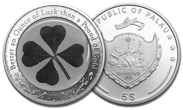 Не меньше эмоций вызывает у простых коллекционеров и серия монет Палау (их в течение нескольких лет изготавливала по заказу островного государства та же немецкая фирма). Каждый экземпляр снабжен капсулой, в которую помещён аккуратно засушенный лист клевера с четырьмя лепестками. Как известно, редко встречающийся клевер-четырёхлистник у многих народов – цветок счастья. Один лепесток для славы, один для богатства, один для любви и один для здоровья. На всех выпусках этих 5-долларовых монет середины 2010-х годов на аверсе (в данном случае будем считать аверсом сторону, где помещён талисман удачи) чеканился девиз на английском языке: «Лучше унция удачи, чем фунт золота». Учитывая, что каждое из изделий весит как раз унцию (31,10 г) и изготовлено из серебра 999-й пробы, подходит как нельзя лучше! Хотя, конечно, у кого-то насчёт реального фунта золота может быть своё особое мнение…