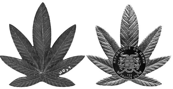 Чуть более десяти лет назад собиратели золото-серебряно-платиновых «гербариев» с удивлением обнаружили среди сотен иных образцов флоры… листья конопли. Это Республика Бенин (разместив заказ на чеканку за границей) в 2010 году подарила миру серебряную монету номиналом в 10 °CFA, где на аверсе живописно изображён лист конопли посевной. В легенде название серии «Известные растения мира» и – для сомневающихся – латинское название «Cаnnabis satíva». А для особо сомневающихся устроен аттракцион: стоит потереть пальцами выпуклый ярко-зелёный листок на монете, как он начинает испускать отчётливый запах марихуаны. Правда, эмитент сразу успокоил: запах каннабиса синтетический, ни психотропными, ни одурманивающими свойствами монета не обладает. Однако успех эмиссии был столь огромен, что уже через год Бенин повторил фокус с запахами. Но на этот раз монета с тем же номиналом отчеканена не в виде серебряного кружка, а в форме изящно вырезанного листа конопли. В 2017 году резной лист промышленной конопли, изготовленный из сусального золота, поместили на монету государств Самоа.