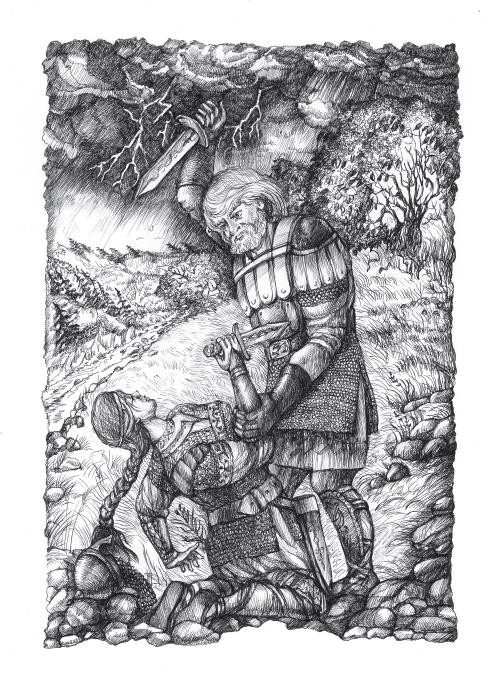 Но стоило только Радегасту увидеть великаншу из-за зеленых ветвей исполинского дерева, так от страха у него захватило дух. Великанша была выше самого неба. Из-под ее островерхого шлема выбивались, будто кудри, черные тучи.