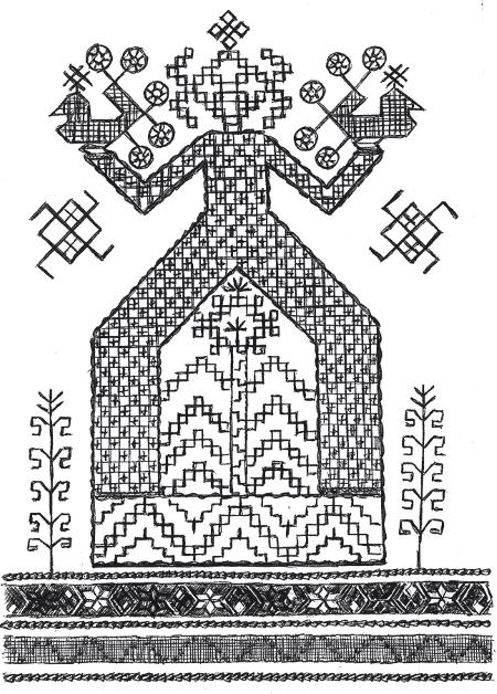 И даже языческим храмам, словно воскресшим из небытия, нашлось место на рушниках и рубахах! Недаром ученые люди обнаруживают изображения затейливых зданий с резными коньками, внутри которых возвышаются столпообразные идолы.