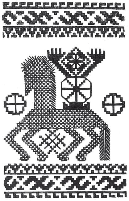 Даждьбог на вышивке изображался как всадник с головой в виде солнечного знака: