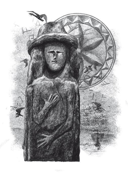 …А теперь пока поведаю о том, кто такой был Стриб и что у него была за семья. Этот поселившийся среди неспокойных туч бог мог принимать образ великана или карлы с огромными веками, которого сопровождала стая черных воронов. Стриб от рождения был почти слеп, не мог открыть глаза без посторонней помощи, но его взгляд проникал во все миры и нес смерть врагам. Лицом Стрибу служила железная маска. На ногах бог носил железные когти, которые сами надевались. С помощью этих когтей Стриб всегда мог забраться на высокую гору или небо. Но, конечно, главной отличительной чертой бога было его могучее дыхание. Оно завывало на все лады. Могло быть и горячим, и ледяным, и сухим, и влажным.