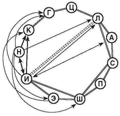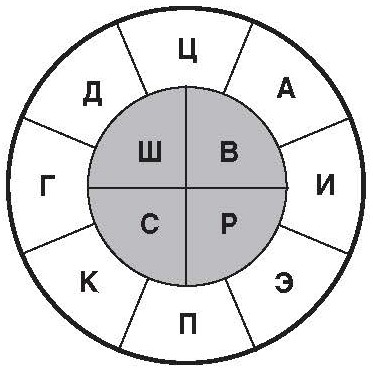 Рисунок 2. Большая схема психопатов. Буквами обозначены: И – истероид, Э – эпилептоид, П – параноид, К – конформоид, Г – гипертим, Д – аддиктоид, Ц – циклоид, С – сенситив, Ш – шизоид, В – виктимоид, Р – рефлексоид.