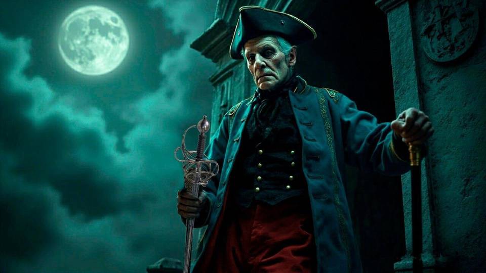 На голове старика красовалась самая настоящая треуголка, правда, лишенная каких-либо украшений из перьев. В сухих костлявых пальцах левой руки, на каждом из которых красовались массивные перстни, незнакомец сжимал крепкую деревянную трость, костяная рукоять которой представляла собой оскаленную пасть какой-то явно мифической твари с несколькими рядами острых зубов, расположенных по кругу.
