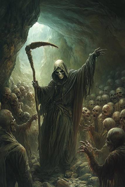 Бледный всадник остановился, и его жуткий инструмент тоже замер. Он обернулся вокруг себя, словно проверяя, все ли мертвые упокоены, и мировому порядку, установленному самим Создателем ничего больше не угрожает. Из кромешной темноты глубокого капюшона тускло сверкнули светящие бельма его глаз, когда взгляд его остановился на тумбе с гигантской змеёй.