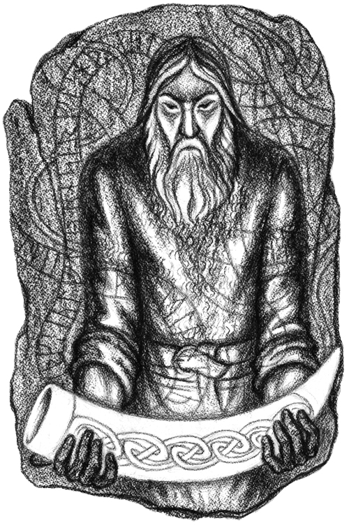 Увидев вход в подземное жилище, викинг спустился в него и увидел трех колдунов. Разложив дощечки с рунами и ножи, они, по всей видимости, замышляли плохое против Ингвара и его дочери.
