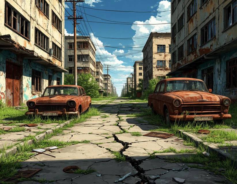 Дверь за мной закрылась, и в тот же миг стены полигона поплыли, исчезая, а вместо них начали появляться очертания зданий и улиц. Не прошло и минуты, как я оказался посреди городка, явно знавшего когда-то лучшие времена. Он выглядел заброшенным и пустынным. Выбитые оконные стёкла, трава, растущая сквозь трещины в асфальте, потускневшие советские лозунги, ржавые автомобили, покосившиеся фонарные столбы, оборванные провода. Прямо город-призрак!