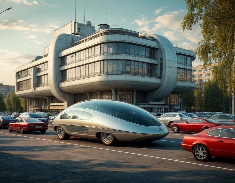 Мой взгляд упал на серое здание в духе советского модернизма с надписью «УНИВЕРСАМ». На парковке у здания скопилось много машин самых разнообразных расцветок и моделей. Я подсознательно искал глазами что-нибудь знакомое, наподобие «Жигулей» или «Москвича», но тщетно. Автомобили выглядели приземистыми, каплевидными, с полностью прозрачным верхом. Зазоров между кузовом и асфальтом практически не было, да и зачем? Дорожное полотно выглядело идеально ровным.