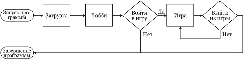 Даже такая простая схема тянет за собой много вещей, которые должна уметь делать наша игра, а значит, их следует спроектировать (документация) и разработать (графика, настройки, код, тексты).