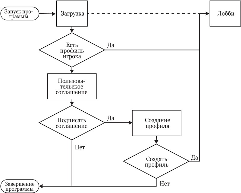 Путь, который проходит игрок по получающейся таким образом схеме, называется уже встречавшимся нам термином «пользовательская история», или «пользовательский опыт». Но в отличие от пользовательских историй из управления проектами, пользовательская история на уровне дизайна не выделяет какой-то отдельной механики и тянется от момента первого знакомства игрока с игрой в магазине до момента, когда он принимает решение прекратить играть в игру и удалить ее. Отдельные шаги на этом пути можно уже выделить как задачи: загрузка ассетов, проверка наличия профиля игрока, экран пользовательского соглашения и т. п.