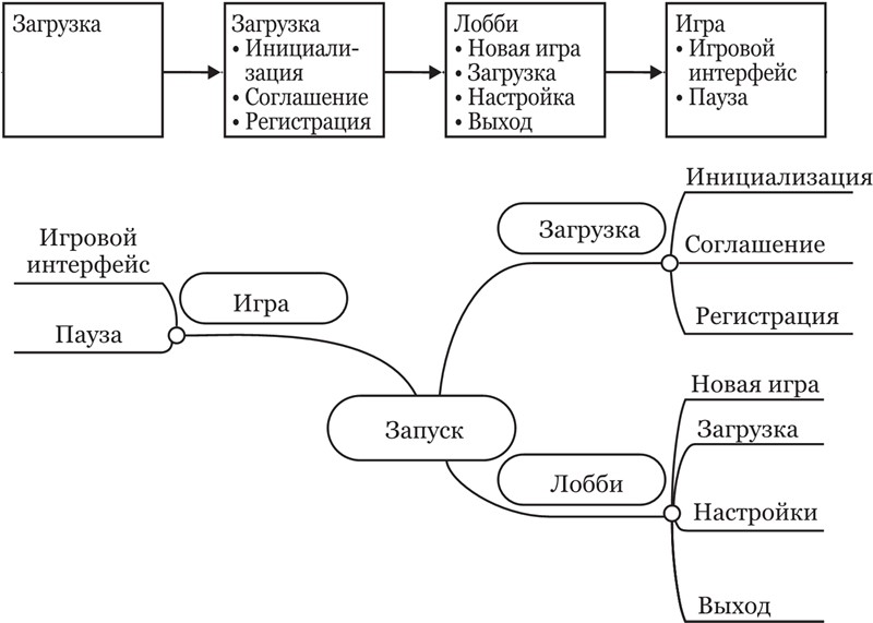 В лобби, кроме перехода в игру, у нас будет меню настроек, загрузка имеющегося сохранения и, конечно, выход из игры. В самой игре будет отдельное меню паузы, сам игровой интерфейс и полный набор действий, которые может совершать игрок. Получающуюся структуру можно изобразить в виде последовательности, дерева или ментальной карты. Это вопрос личного удобства.