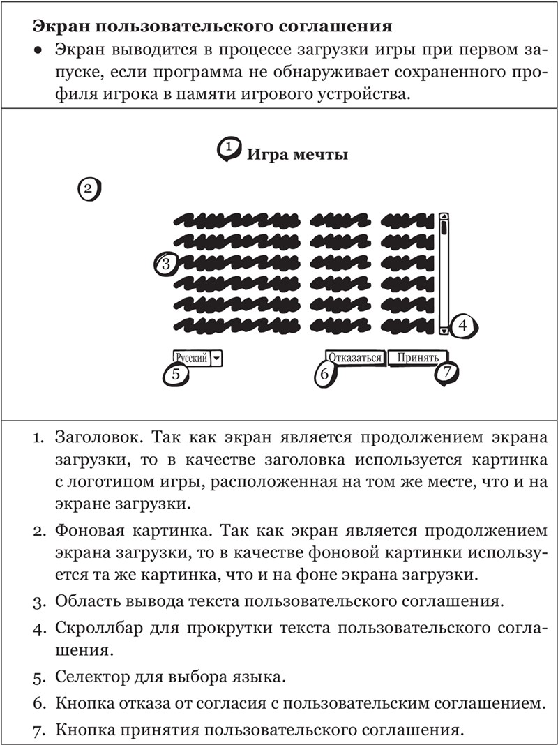 Каждый из этих шагов или элементов содержит в себе какую-то механику – действие, которое должна выполнить сама программа или игрок. Кроме механики, у элемента игры может быть графика и какие-то настройки. Их описание и является дизайн-документацией игры. Например, то же окно подтверждения пользовательского соглашения.